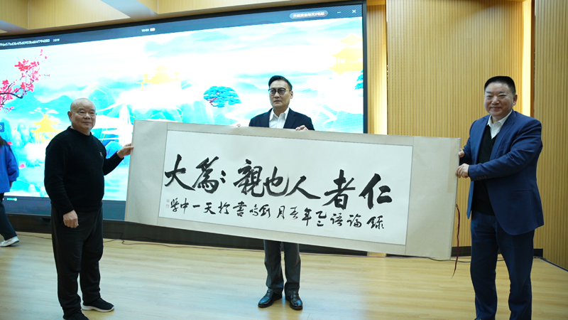 校園參訪中,孔垂長一行實地考察了教學設施與校園環境,隨后出席在學校多功能報告廳舉辦的傳統文化歡迎活動。該校師生以拜師禮、古琴演奏、太極展演及《弟子規》吟誦等節目,展現對中華文化的傳承。孔垂長以“學以成人”為主題發表致辭,強調在人工智能時代,教育更應回歸“成人之道”:“教育需培養有道德判斷力的心靈與理解人性溫度的靈魂。孔子所言‘志于道,據于德,依于仁,游于藝’啟示我們,在科技洪流中需守護對美的感知力,保持思辨銳度。”他勉勵學子成為“科技方舟的駕馭者”與“文化精神的擺渡人”,并向天一中學贈送親筆題字的晶瓷孔子像,校方則以書法作品回贈。