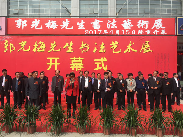 中國毛體書法家協會理事,中國毛體書法家協會安徽分會副主席、開渠書畫院院長、中國毛體書法家協會淮北分會主席郭光梅先生書法藝術展于2017年4月15日上午9點30分在淮北體育場東門淮北市體育中心展廳隆重舉行開幕式。市人大常委會常務副主任方宗澤,市委常委、市委宣傳部部長顧文,市人大常委會副主任楊彥穎、余敏輝,市政協副主席蔣守彬、李彥秋、錢丹嬰,市人大常委會秘書長陳朝祥,市政府秘書長宋偉出席開幕式。